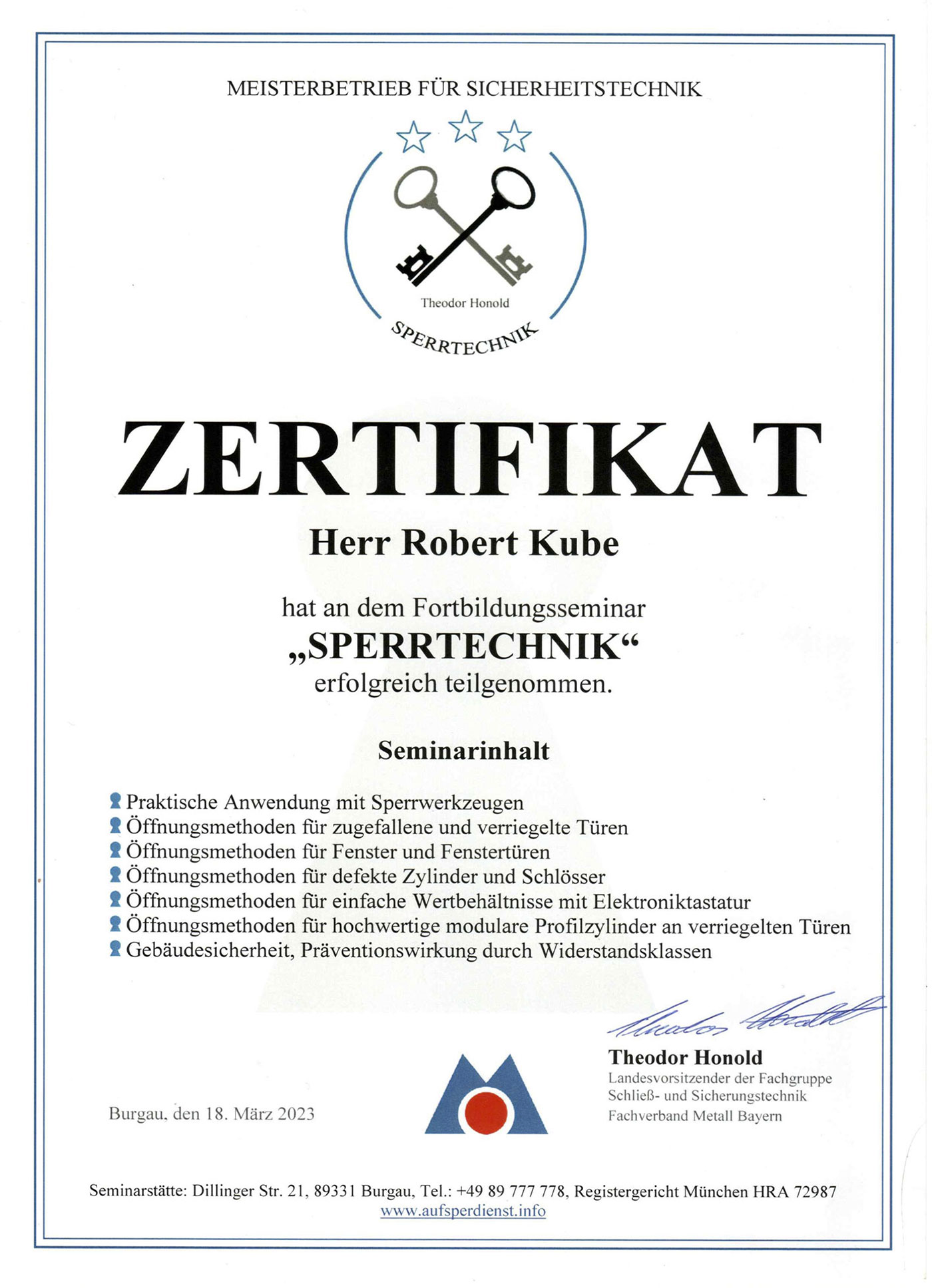 Durch die enge Zusammenarbeit mit Polizei, Gerichtsvollziehern und anderen Behörden habe ich zudem eine fundierte Schulung im Bereich Schlüsseldienst absolviert und zertifiziert abgeschlossen. Neben diesen spezialisierten Einsätzen biete ich meine Schlüsseldienst-Leistungen aber auch für Privatpersonen und Unternehmen an – zuverlässig, schnell und professionell.