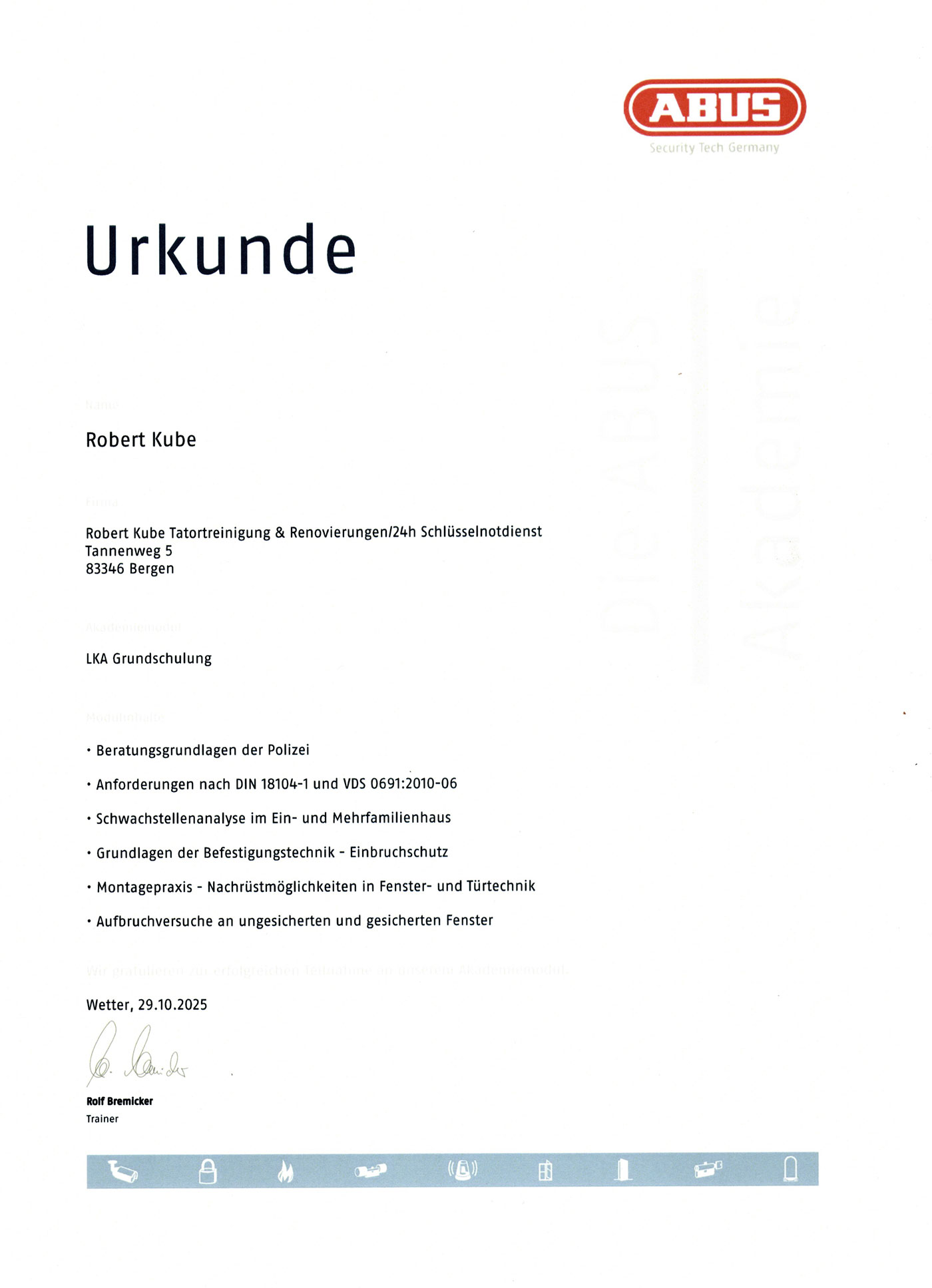 Auf Empfehlung der Polizei habe ich mich während der Corona-Pandemie zum Desinfektor mit AZAV-Zertifikat umgeschult. Dieser Schritt war der Beginn meiner Spezialisierung auf Tatortreinigungen, die ich heute als zertifizierter Experte mit höchster Sorgfalt und Diskretion durchführe.